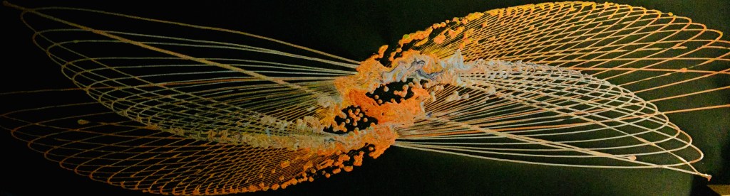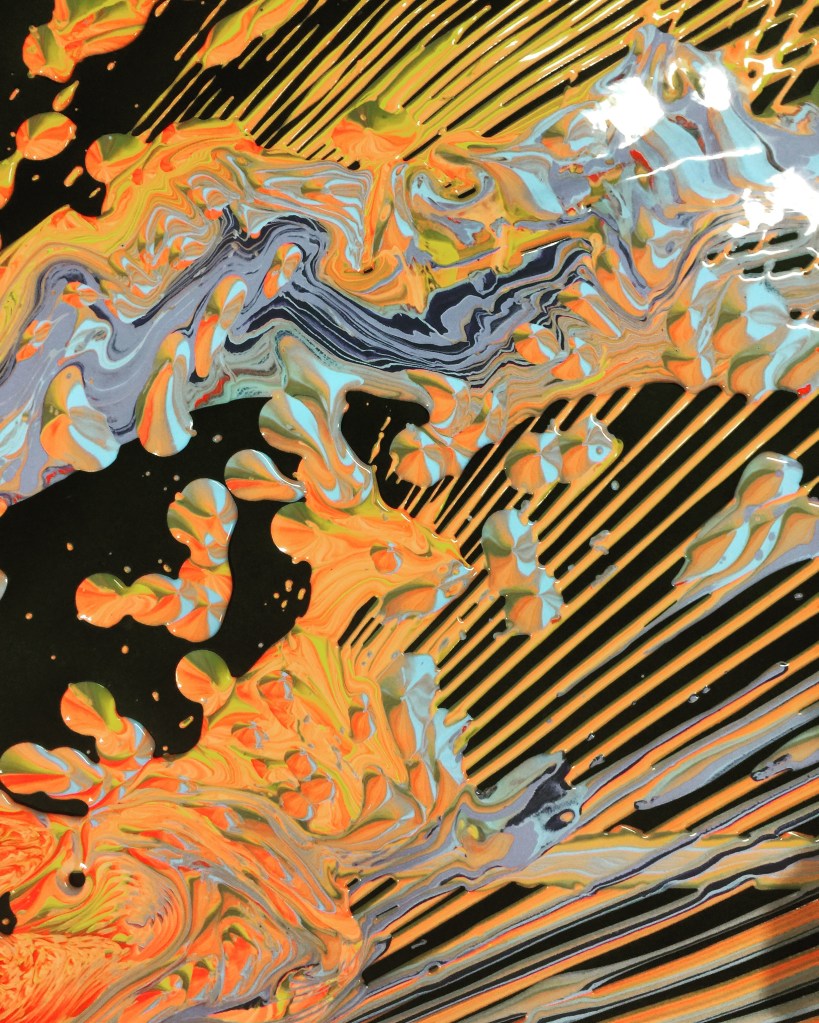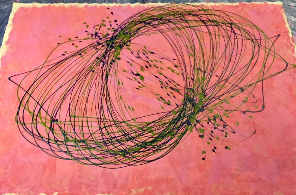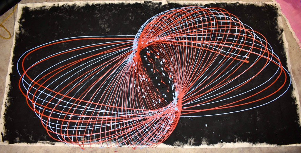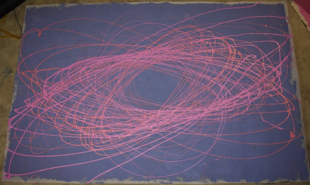 This next one was my last pendulum pour. For that reason it was bittersweet. I have thoroughly loved this process, getting messy, playing with forces and color. Now it’s time to clean up and give my family the garage space back. This one is a nod to my first Caerus Artist Residency, in which I worked with digital drawings. There was one with a large green and blue sphere being swept up into the elsewhere, while a pink figure stands in the corner. Temporal Force was created with two quart cans of paint taped together and spinning.