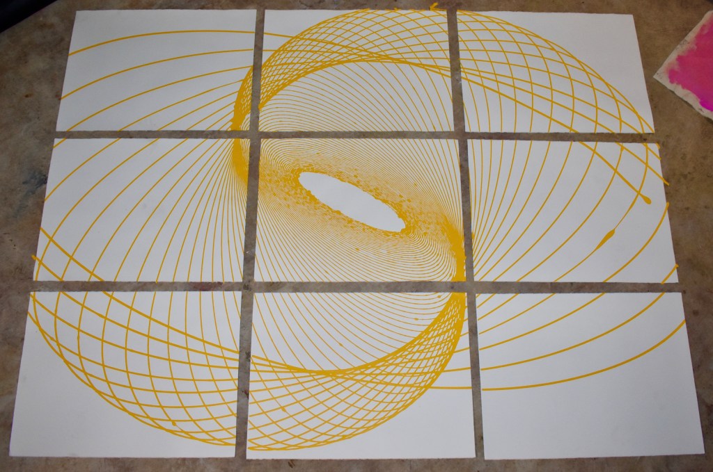 I eventually learned and played with the trajectory of the pendulum, the size of the hole, taping two cans together, and layering different color paint into one can, then pouring from it.